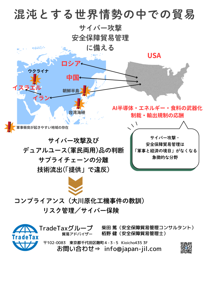 米中ロ対立や中東情勢の緊張が高まる中、貿易は「安全保障」と切り離せない時代に突入しています。AI半導体・エネルギー・食料を巡る制裁や輸出規制の応酬により、企業には高度なリスク管理とコンプライアンス対応が求められています。